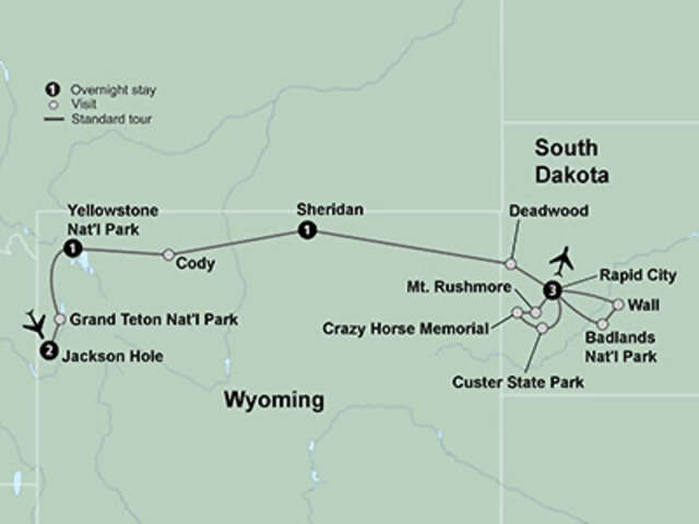 Visit Yellowstone, Grand Teton National Park, Mt. Rushmore and the Crazy Horse Memorial on this great American Adventure. Spend two nights in the cowboy town of Jackson Hole, Wyoming, the crown jewel of the Northern Rockies. Experience the Wild West as it once was at Yellowstone National Park, home to an incredible array of wildlife including free-ranging herds of buffalo. Check off one of life’s must-dos as you thrill upon seeing Old Faithful erupt. Marvel at Grand Teton National Park’s towering peaks, marked with mountain glaciers. Soak in stunning views of Mt. Rushmore and the Crazy Horse Memorials.