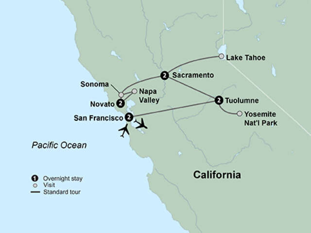 Experience the Northern California lifestyle. Explore must-sees such as Fisherman’s Wharf and the Golden Gate Bridge. Marvel at the beauty of one of America’s most beloved National Parks, Yosemite. Glide on the pristine waters of breathtaking Lake Tahoe on a paddle wheeler. Discover fascinating facts about train travel at the California Rail Museum. Sip California’s wines at included wine tastings. Relax at a family-owned vineyard in Napa Valley, savoring the surrounding gardens and orchards while enjoying a farm-to-table lunch. This is a chance to live the good life.