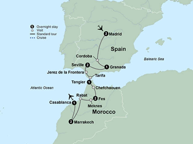 Across two continents and two countries, take one incredible journey through Spain and Morocco, where treasures untold are simply waiting to reveal themselves. In Spain’s historic capital of Madrid, discover dynamic history and culture. Travel to the Moorish city of Córdoba to encounter the religious marvel of the Mezquita. Journey to Granada and see the Alhambra, the world-famous hilltop palace. In Seville the city’s history and legends come to life in narrow streets and quaint courtyards; learn the secrets to an out-of-this-world paella, and take your seat for an authentic Flamenco show! Stop in Spain’s sherry region for a tasting and then board your high-speed ferry to Africa, just a short ride across the Strait of Gibraltar, arriving in Morocco’s city of Tangier. In this incredible country, discover the Indigo-blue streets and painted Medina in Chefchaouen, the “Blue City” of Morocco. In Fes, the “Mecca of the West,” visit a family-run riad in the Medina for a taste of traditional Moroccan delights, see the ancient door of Bab El Mansour, and the Bab El Khamis flea market in Meknes. Choose how you explore Marrakech: visit either the Yves Saint Laurent Museum OR the Jardin Majorelle Botanical Gardens, a colorful oasis in the center of Marrakech. Finally, in Casablanca, tour the masterful Hassan II Mosque, and see the city by night on a drive along the seashore, where you’ll end your incredible journey through the treasures and mysteries, of Spain and Morocco, over dinner at Rick’s Café, the legendary saloon from the film Casablanca.