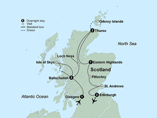 From its rugged sea-sprayed islands to its stately castles rich in history, Scotland’s treasures are as diverse as they are compelling. Learn how to play the bagpipes and enjoy dinner at the National Piping Centre’s farm-to-table restaurant. Take a cruise on famed Loch Ness. Visit a local family on their working farm and meet their sheepdogs. Marvel at the stunning Isle of Skye, the magnificent landscapes of the Highlands and the mountain wilderness of Cairngorms National Park. Explore the magical Orkney Islands’ ancient Skara Brae and prehistoric Ring of Brodgar. Visit Dunrobin Castle. Sample Scotch whisky during a distillery tour. Stop in St. Andrews, home of the Royal and Ancient Golf Club. Explore the regal city of Edinburgh. Put a modern twist on traditional Scottish ingredients during an interactive cooking experience.