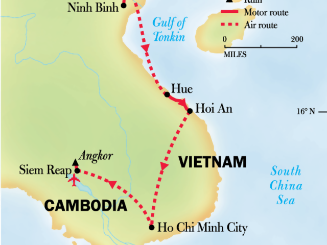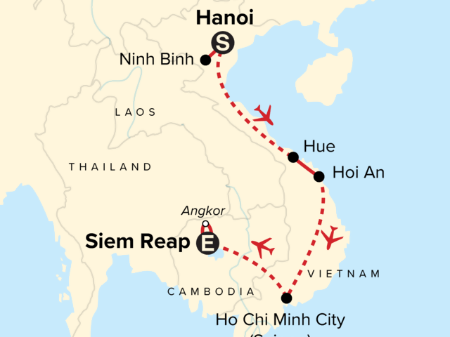 Your Family Journeys Moment: Phare Circus Workshop, Siem Reap. Arrival transfer. Cyclo tour of Hanoi's Old Quarter. Water puppet Show. Temple visit in Hoa Lu. Bamboo boat trip on Ngo Dong River. Countryside bicycle tour in Tam Coc. Hands-on cooking experience in Tam Coc. Pottery village visit in Bat Trang. Guided tour of the city and countryside of Hue. Walking tour of Hoi An Old Town. Hoi An Countryside cycle and basket boat float. Cyclo tour of Ho Chi Minh City. Guided tour of the Cu Chi Tunnels. Guided tour of Angkor Wat. Internal flights. All transport between destinations and to/from included activities