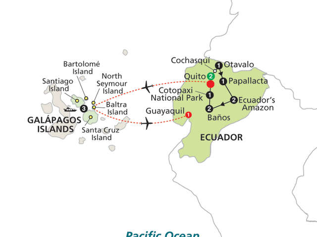 Explore Ecuador, one of the world’s most biodiverse countries, from the Andes and the Amazon to the amazing Galápagos Islands! Begin in the capitol city of Quito, where colonial history still permeates the air and you are surrounded by beautiful architecture, as well as religious and cultural sites. Head north to the Andean town of Otavalo to visit its famous Indian market, full of textiles, animals, vegetables, and handicrafts. It’s a true glimpse into traditional Ecuadorian culture, which continues during your cooking class and overnight at a local hacienda. Tour a working rose plantation, Ecuador’s main export, before relaxation time in the volcanic hot springs of Papallacta. Also spend two nights immersed in Ecuador’s Amazon jungle on the banks of the Napo River. Your time in the Amazon basin will be filled with Naturalist-guided nature walks in search of the vast flora and fauna found in the area, canoe rides, night walks, and much more! From here, continue to the town of Baños, surrounded by the Andes and famous for its year-round temperate weather, beautiful hot springs, and waterfalls. End your vacation with a drive through the “Avenue of the Volcanoes” to Cotopaxi National Park with one of the highest active volcanoes of the same name rising above you. End your trip of a lifetime with a 3-night cruise through the Galápagos Islands on the Galápagos Legend. Your time in the archipelago introduces you to species of animals that do not exist anywhere else on the planet! From blue-footed boobies, magnificent frigate birds, and Darwin’s finches to giant tortoises, sea lions, and iguanas, the wildlife here is prolific. Your time here will definitely not disappoint! From ancient cities and natural wonders to the Amazon wilds, impressive Andes, and incomparable Galápagos, this vacation to Ecuador has it all! So grab your camera and be prepared for the trip of a lifetime.