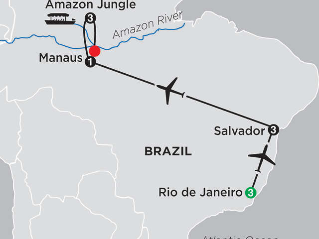 Vibrant cities combined with nature at its finest in the Amazon—that’s what awaits you on this Best of Brazil tour with overnights in Rio de Janeiro, Salvador, Manaus, and the Amazon.Guided sightseeing in the cities features the must-see sites, including the cog railway in Rio de Janeiro that takes you to the summit of Corcovado to view the infamous Christ the Redeemer statue and 360-degree views of the surrounding tropical forests, pristine beaches, and panoramic views of the bustling city and Guanabara Bay. Fly to Salvador, which was the first colony of Portuguese Brazil and also the first capital of Brazil. During your guided walking tour of this UNESCO World Heritage Site, see some of the finest colonial architecture in the Americas, the 17th-century Jesuit Cathedral, and the baroque Church of St. Francis. Learn about this port city and its varied past, including being the first slave trading center in the Americas, which is why today it’s considered the center for Afro-Brazilian culture. You’ll also have a free day to explore on your own or to take an optional excursion in both cities. Continue north to the banks of the Amazon River where you will find the gateway city to the Amazon, Manaus. Evidence of the opulent era in the late 19th century can still be seen during your city tour including the ornate Opera House built from materials brought from Europe. A highlight of this Brazil tour is the time you’ll spend in the Amazon. You’ll visit a native Amazon village to see what life is like on the Amazon River and you’ll enjoy Naturalist-guided walks to see the flora and fauna that thrive in the Amazon. You’ll cruise down the Rio Negro to the Meeting of the Waters, where the Rio Negro and Rio Solimões come together to form the mighty Amazon River. You’ll also visit a monkey jungle reserve, where researchers work to rehabilitate primates and where you’ll have a chance to get up close to the monkeys.From the lively cities to the natural sounds of the jungle, this value-minded Brazil tour has it all! Be sure to bring your camera and get ready for a trip of a lifetime!