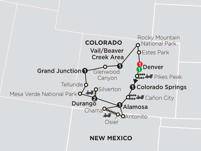 Discover Colorado’s breathtaking scenery, beautiful national parks, and historic trains on this Colorado trains tour. In Colorado Springs, take the cog railway, the world’s highest cog railway, up to the summit of 14,115-foot Pikes Peak for amazing views as far as the eyes can see. As you ride the Royal Gorge Route Railroad through the Colorado Rockies, witness stunning scenery, marvel at the steep canyon walls, and keep an eye out for wildlife such as eagles and big horn sheep. Cross the Colorado-New Mexico border 11 times as you ride the Cumbres & Toltec Scenic Railroad, an authentic steam railroad that will take you through unspoiled beauty. Finally, ride the Durango & Silverton Narrow Gauge Railroad, a legendary coal-fired, steam-powered train that hugs deep canyon walls and offers magnificent beauty traveling through San Juan National Forest. Step back in time as you visit Mesa Verde National Park, a UNESCO World Heritage Site, to see how the Ancestral Pueblo people lived in cliff dwellings from 600 to 1300 AD. On this Colorado trains tour, you’ll also visit Rocky Mountain National Park, where a stop at 12,183 feet provides stunning alpine views, and Colorado National Monument, with towering monoliths and red-rock canyons. Walk along the Royal Gorge Bridge, the world’s highest suspension bridge, and marvel at the rugged rock walls that plunge more than 1,000 feet down to the Arkansas River. Fun train rides, gorgeous scenery, and more await you on this Colorado trains tour designed for value-minded travelers. Just be sure to bring your camera!
