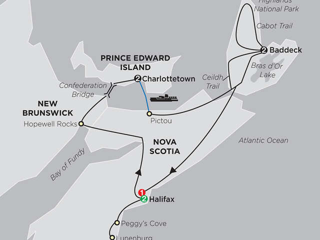 Discover the heart of Canada’s Atlantic seacoast on this wonderful vacation featuring Nova Scotia and Prince Edward Island. This tour begins and ends in Halifax, overnights also in Charlottetown and Baddeck, and includes scenic drives, beautiful national parks, and quaint fishing villages. Highlights of this Atlantic Canada tour include a visit to Peggy’s Cove, a charming fishing village with a picturesque lighthouse (one of the world’s most photographed places), and Lunenburg, a small port town where you’ll visit the Fisheries Museum of the Atlantic, a UNESCO World Heritage Site. Learn about the world’s highest and wildest tides at Hopewell Rocks, where time and tides up to 52 feet have created distinctive sandstone formations topped with trees. More scenic beauty awaits you in Prince Edward Island National Park, famous for its wind-sculpted dunes and sandy, picturesque beaches. On Cape Breton Island, have your camera ready as you embark on the Cabot Trail, one of the world’s most scenic drives, and visit Cape Breton Highlands National Park, resembling the Scottish coastal regions. Enjoy panoramic views of rugged cliffs, deep valleys, forested slopes, the Atlantic Ocean, and the Gulf of St. Lawrence.In addition to stunning scenery, this Atlantic Canada tour also includes visits to an Acadian maple shop to learn about the history and production of pure Nova Scotia maple syrup; the Anne of Green Gables Farmhouse, a National Historic site; and the Alexander Graham Bell Museum. With gorgeous scenery and picturesque villages, this value-minded tour through Atlantic Canada will delight all of your senses!