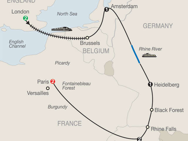 LONDON Guided sightseeing, visit St. Paul’s Cathedral and see the Changing of the Guard, if heldLONDON–BRUSSELS By high-speed Eurostar trainAMSTERDAM Canal cruiseRHINE CRUISEHEIDELBERG Walking tour of the Old Town, take pictures of the castle; [LF] dinner with beer at a local restaurantBLACK FOREST [LF] Woodcarving demonstration; lunch with regional specialtiesRHINE FALLSLUCERNE Walking tour including the Lion Monument and the Chapel Bridge; [LF] Swiss chocolate surprisePARIS Guided sightseeing, ascend the Eiffel TowerHeadsets throughout the tour