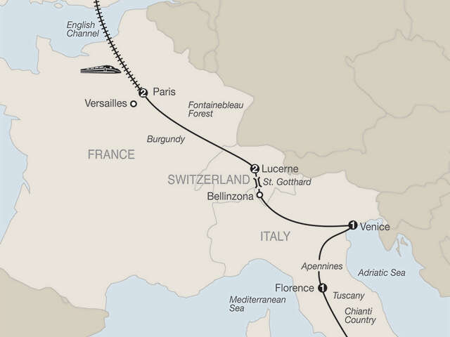 ROME Welcome dinner at a local restaurant; guided sightseeing, visit the Vatican Museums and Sistine Chapel, St. Peter’s Square and Basilica, the Colosseum and Roman ForumFLORENCE Guided walking tour, visit Michelangelo’s David and Signoria Square; [LF] pizza party at Finisterrae restaurantVENICE Visit St. Mark’s Square; glassblower demonstration; [LF] pasta dinner at Rossopomodoro restaurant, private water-taxi ride through the Grand Canal BELLINZONA[LF] Visit the Castelgrande courtyard and enjoy a light lunch with wine LUCERNE Walking tour including the Lion Monument and the Chapel Bridge; [LF] taste Swiss chocolate pralinesPARIS Guided sightseeing, ascend the Eiffel TowerPARIS–LONDON By high-speed Eurostar trainLONDONGuided sightseeing, visit St. Paul’s Cathedral and see the Changing of the Guard, if heldHeadsets throughout the tour