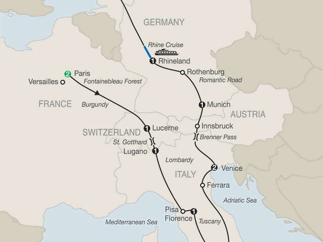 PARIS [LF] Welcome dinner at a local restaurant, followed by a Seine River cruise; guided sightseeing, ascend the Eiffel TowerLUCERNE Walking tour including the Lion Monument and the Chapel BridgePISAMarvel at the legendary Leaning TowerFLORENCE [LF] A special dinner at Finisterrae restaurant; guided sightseeing, visit Michelangelo’s David and Signoria SquareROME Guided sightseeing, visit the Vatican Museums and Sistine Chapel, St. Peter’s Square and Basilica, the Colosseum and Roman ForumFERRARAWalk along Este Castle to the cathedralVENICE Private boat ride; guided walking tour, visit St. Mark’s Square, Doges’ Palace and the Bridge of Sighs; glassblower demonstrationINNSBRUCK Walk through the Old Town to the Golden RoofMUNICH Visit Marienplatz and [LF] the famous Hofbräuhaus; orientation drive including the Olympic StadiumROTHENBURG Walking tour of the walled townRHINE CRUISE[LF] Enjoy Kaffee und Kuchen (coffee and cake)AMSTERDAM Guided sightseeing and canal cruise; visit a major diamond centerHeadsets throughout the tour