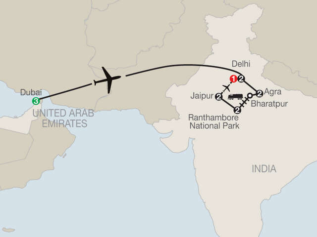 DUBAISightseeing with a Local Guide; visit Jumeirah Mosque, the spice souk, and the gold souk; Host service during your stayDELHIVisit Qutub Minar, Humayan’s Tomb, and Gurudwara Bangla Sahib; [LF] rickshaw ride through Chandni Chowk bazaar; welcome dinner with Indian cooking demonstrationAGRA Visit the Taj Mahal at sunrise by [LF] tonga, and Agra FortBHARATPUR–RANTHAMBORE NATIONAL PARKTravel by trainRANTHAMBORE NATIONAL PARK Three game drives by open-air, 4-wheel drive safari vehicleJAIPUR[LF] Home-hosted dinner with Indian noble family featuring a sari- and turban-tying demonstration; visit Amber Fort, Hawa Mahali, and the City Palace & Museum