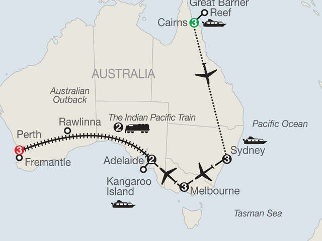 From Sydney, Australia’s largest and most famous city, to Perth, Western Australia’s capital city, this tour through Australia—stopping first at the Great Barrier Reef (Cairns)—is a once-in-a-lifetime vacation. You’ll spend three nights each in Cairns, Sydney, Melbourne, and Perth; two nights in Adelaide; and two nights aboard the historic Indian Pacific train traveling across Australia.
