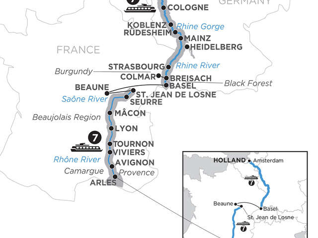 Day 1 Amsterdam (Embarkation): welcome receptionDay 2 Amsterdam: canal cruiseDay 3 Cologne: choice of Cologne highlights walking tour, or Jewish Heritage walking tourDay 4 Koblenz–Rhine Gorge–Rüdesheim: guided sightseeing in Koblenz; scenic cruise through the Rhine Gorge; visit Siegfried’s Mechanical Musical Instrument Museum in Rüdesheim; special treatDay 5 Mainz. Excursion to Heidelberg: guided walk, visit the Gutenberg Museum in Mainz; guided tour of Heidelberg Castle, see the Great VatDay 6 Strasbourg: guided sightseeing, visit La Petite France district and the gothic cathedral Day 7 Breisach. Excursion to Black Forest: choice of excursion to Black Forest, or guided tour in ColmarDay 8 Basel (Disembarkation)–Beaune–St. Jean de Losne (Embarkation)–Seurre: transfer to Beaune, visit the Hôtel-Dieu, or join a wine tasting in a local cellar; onboard welcome receptionDay 9 Seurre–Mâcon: leisurely cruising; onboard lecture about wine; free time in Mâcon or Chardonnay excursionDay 10 Lyon: onboard wine and cheese tasting; guided sightseeing; picture stop on Fourvière Hill Day 11 Lyon: a free day to explore this fascinating city at leisure, or excursion to Beaujolais; onboard food & wine pairing dinnerDay 12 Tournon/Tain l’Hermitage–Viviers: guided walk in Tournon with wine and chocolate tasting, or hike in the vineyeards (weather permitting); guided walk in Viviers, visit the Old Town and the cathedralDay 13 Avignon: guided sightseeing, visit Palace of the Popes and excursion to Châteauneuf du PapeDay 14 Arles: guided sightseeing in Arles, visit the Roman Amphitheatre; cruise into the Camargue region (daylight permitting)Day 15 Arles (Disembarkation)–Aix-en-Provence: transfer to Aix-en-Provence; guided walking tour visit Cathedral of the Holy SaviourDay 16 Aix-en-Provence: day at leisureDay 17 Aix-en-Provence–Nice: travel to Nice by high-speed TGV train (first class); guided walking tour with Promenade des Anglais and the old townDay 18 Nice: day at leisureDay 19 Nice: your vacation ends this morning