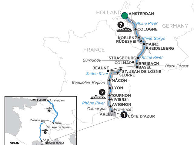 Day 1 Amsterdam (Embarkation): welcome receptionDay 2 Amsterdam: canal cruiseDay 3 Cologne: choice of Cologne highlights walking tour, or Jewish Heritage walking tourDay 4 Koblenz–Rhine Gorge–Rüdesheim: guided sightseeing in Koblenz; scenic cruise through the Rhine Gorge; visit Siegfried’s Mechanical Musical Instrument Museum in Rüdesheim; special treatDay 5 Mainz. Excursion to Heidelberg: guided walk, visit the Gutenberg Museum in Mainz; guided tour of Heidelberg Castle, see the Great VatDay 6 Strasbourg: guided sightseeing, visit La Petite France district and the gothic cathedral Day 7 Breisach. Excursion to Black Forest: choice of excursion to Black Forest, or guided tour in ColmarDay 8 Basel (Disembarkation)–Beaune–St. Jean de Losne (Embarkation)–Seurre: transfer to Beaune, visit the Hôtel-Dieu, or join a wine tasting in a local cellar; onboard welcome receptionDay 9 Seurre–Mâcon: leisurely cruising; onboard lecture about wine; free time in Mâcon or Chardonnay excursionDay 10 Lyon: onboard wine and cheese tasting; guided sightseeing; picture stop on Fourvière Hill Day 11 Lyon: a free day to explore this fascinating city at leisure, or excursion to Beaujolais; onboard food & wine pairing dinnerDay 12 Tournon/Tain l’Hermitage–Viviers: guided walk in Tournon with wine and chocolate tasting, or hike in the vineyeards (weather permitting); guided walk in Viviers, visit the Old Town and the cathedralDay 13 Avignon: guided sightseeing, visit Palace of the Popes and excursion to Châteauneuf du PapeDay 14 Arles: guided sightseeing in Arles, visit the Roman Amphitheatre; cruise into the Camargue region (daylight permitting)Day 15 Arles (Disembarkation)–Côte d’Azur: evening in Côte d’AzurDay 16 Côte d’Azur–Barcelona, Spain: transfer to Nice airport for your flight to BarcelonaDay 17 Barcelona: guided sightseeing, visit Casa Battló and Sagrada Familia BasilicaDay 18 Barcelona: day at leisureDay 19 Barcelona: your vacation ends this morning