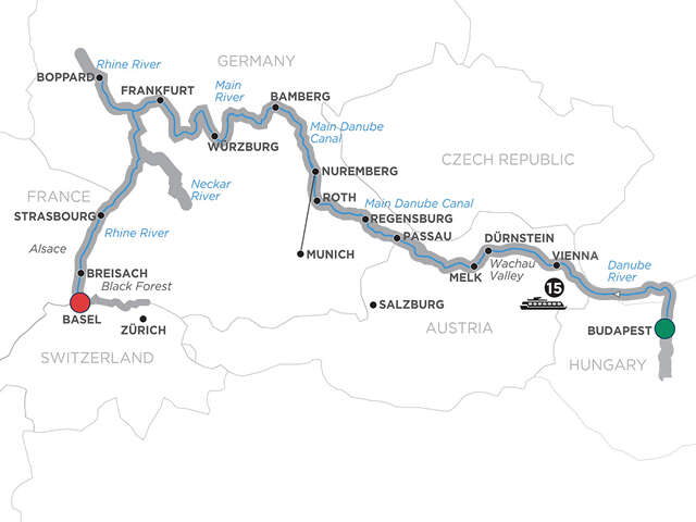 Day 1 Budapest (Embarkation): onboard welcome receptionDay 2 Budapest—Vienna: cruisingDay 3 Vienna: guided sightseeingDay 4 Dürnstein—Wachau Valley—Melk: choice of guided tour, or hike up to the castle ruins in Dürnstein; scenic cruise through the Wachau Valley; guided tour of the Benedictine Abbey in Melk; wine tasting on boardDay 5 Passau: guided walkDay 6 Regensburg: guided walk beer tasting on boardDay 7 Nuremberg: choice of guided sightseeing, or Nuremberg Rally Grounds tourDay 8 Nuremberg. Excursion to Munich: full day guided tour in MunichDay 9 Bamberg: guided tour, see the Old Town Hall Day 10 Würzburg: guided tour, visit to the Bishop’s Residenz Day 11 Main River Village: guided tourDay 12 Frankfurt: choice of guided tour in Frankfurt, or guided tour in SeligenstadtDay 13 Boppard–Rhine Gorge—Rüdesheim: time at leisure in Boppard; cruise through the Rhine Gorge; visit to Siegfried’s Mechanical Musical Instrument Museum in Rüdesheim; special treat Day 14 Strasbourg: guided tour, visit to La Petite France district and the gothic cathedralDay 15 Breisach. Excursion to Black Forest: choice of excursion to Black Forest, or guided tour in ColmarDay 16 Basel (DISEMBARKATION): your vacation ends this morning
