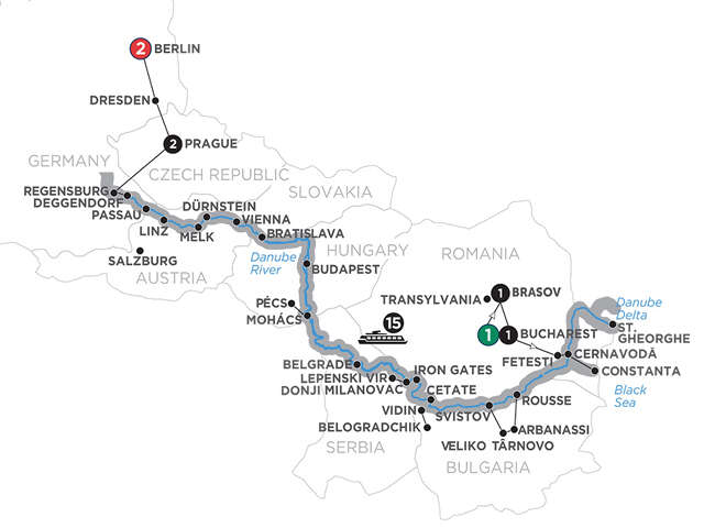Day 1 Bucharest: welcome to BucharestDay 2 Bucharest. Excursion to Transylvania—Brasov: guided visit of Dracula’s Bran CastleDay 3 Brasov–Bucharest: guided sightseeing in Brasov and Peles CastleDay 4 Bucharest–Fetesti (Embarkation): guided sightseeing in Bucharest; onboard welcome receptionDay 5 St. Gheorghe: excursion to Danube Delta: km 0 celebration Day 6 Cernavodă. Excursion to Constanta: guided sightseeing, visit the National History and Archaeological Museum in ConstantaDay 7 Rousse. Excursion to Veliko Târnovo & Arbanassi: guided sightseeing, visit Tsarevet’s Fortress in Veliko Târnovo, and the Ethnographic Museum and the Church of the Nativityin Arbanassi; or guided sightseeing of RousseDay 8 Vidin—Belogradchik: guided sightseeing to Vidin’s fortress and see the rock formations in BelogradchikDay 9 Iron Gates—Donji Milanovac: cruise through the Iron Gates gorge; visit Lepenski Vir archaeological siteDay 10 Belgrade: guided sightseeing; lecture on boardDay 11 Mohács. Excursion to Pécs: guided tour and organ concert in PécsDay 12 Budapest: day at leisureDay 13 Budapest: guided tour, see Heroes’ SquareDay 14 Bratislava: guided sightseeing, visit St. Martin’s CathedralDay 15 Vienna: guided tour, see the Kuntskammer’s collection; choice of additional sightseeing, or a complimentary museum ticketDay 16 Dürnstein—Wachau Valley—Melk: choice of guided walk, or hike up to the castle ruins in Dürnstein; guided visit of the Benedictine Abbey in Melk; wine tastingDay 17 Linz: guided walkDay 18 Passau: guided walkDay 19 Deggendorf (Disembarkation)—Regensburg—Prague: transfer to Regensburg, guided sightseeing; travel by motorcoach to PragueDay 20 Prague: guided sightseeing, see the Astronomical Clock and visit Hradčany Castle groundsDay 21 Prague—Dresden—Berlin: transfer to Dresden and city sightseeing; transfer to BerlinDay 22 Berlin: city sightseeingDay 23 Berlin: your vacation ends this morning