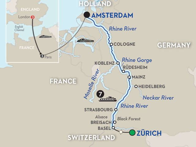 Cruise: deluxe 7-night cruise in an outside stateroom with Avalon’s exclusive Comfort Collection BedsSMDay 1 Zürich–Transfer to Basel (Embarkation): onboard welcome receptionDay 2 Breisach. Excursion to the Black Forest: visit a woodcarver’s workshop; Christmas marketDay 3 Strasbourg: guided sightseeing, visit La Petite France district and the gothic cathedral, Christmas MarketDay 4 Excursion to Heidelberg–Mainz: guided visit of the castle, see the Great Vat in Heidelberg; visit the Gutenberg Museum in Mainz, Christmas MarketDay 5 Rüdesheim–Rhine Gorge–Koblenz: visit Siegfried’s Mechanical Musical Instrument Museum and enjoy a special treat in Rüdesheim; cruise through the Rhine Gorge; guided walk in KoblenzDay 6 Cologne: choice of guided city walk or Jewish Heritage walk, Christmas MarketDay 7 Amsterdam: canal cruise and Illumination Cruise during Lights Festival.Paris & London: 6 nights hotel accommodation with buffet breakfast (B); Monograms Local Host Service & Destination Guides with city maps; guided sightseeing, inside visits and special features are shown in UPPERCASE; high-speed Thalys train (first-class) from Amsterdam to Paris; high-speed Eurostar train (standard class*) from Paris to London (porterage available for one suitcase on Paris–London stretch only); transfers to/from train stations; discounts at the famous Galeries Lafayette department store in Paris.