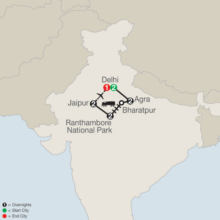 DELHIVisit Qutub Minar, Humayan’s Tomb, and Gurudwara Bangla Sahib; [LF] rickshaw ride through Chandni Chowk bazaar; welcome dinner with Indian cooking demonstrationAGRA Visit the Taj Mahal at sunrise by [LF] tonga, and Agra FortBHARATPUR–RANTHAMBORE NATIONAL PARKTravel by trainRANTHAMBORE NATIONAL PARK Three game drives by open-air, 4-wheel drive safari vehicleJAIPUR[LF] Home-hosted dinner with Indian noble family featuring a sari- and turban-tying demonstration; visit Amber Fort, Hawa Mahali, and the City Palace & Museum
